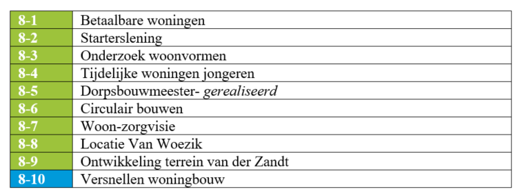 Met het woningbouwprogramma zorgen we ervoor dat de woningen aansluiten bij de woonbehoefte. We hebben speciaal aandacht voor groepen die in de knel zitten. Jongeren die in hun eigen dorp willen blijven wonen. Senioren die behoefte hebben aan levensloopbestendige woningen en voorzieningen dichtbij. En jonge gezinnen die hier willen starten of doorgroeien. Ook willen we de mogelijkheden voor extra woningbouw in de bestaande woningvoorraad beter benutten, bijvoorbeeld door woningsplitsing. Er is een grote behoefte aan sociale huurwoningen en goedkope koopwoningen. Hiervoor maken we prestatieafspraken met de woningcorporaties. Ook zien we erop toe dat arbeidsmigranten veilig en goed kunnen wonen. Daarover maken we afspraken met de werkgevers.