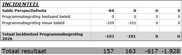 In onderstaande tabellen laten we het verloop van het structureel en incidenteel begrotingssaldo zien, vanaf de Begroting 2025, via de Perspectiefnota naar de voorliggende Begroting 2026. De jaren 2026 en 2027 laten een structureel sluitend saldo zien. Vanaf 2028 zien we, met name vanwege teruglopende inkomsten in het gemeentefonds, structurele tekorten. Het incidenteel perspectief kan worden opgevangen binnen het structurele begrotingssaldo.